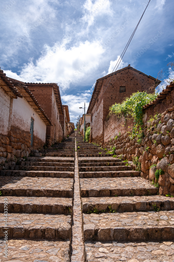 Traditional cobbled streets in Chinchero, Peru, with white adobe walls