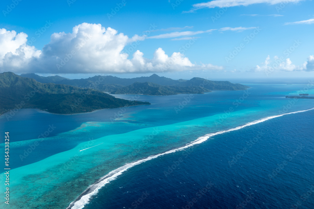 Aerial view of Tahaa island, French Polynesia, with turquoise lagoon and reef