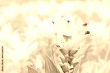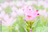 Close-up of a light pink Siam tulip with a green stem, standing gracefully against a softly blurred garden background.