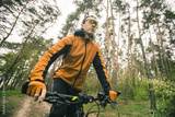 Young attractive man wears yellow suit ride the bike on the forest road