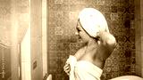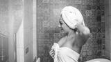 Young woman in white towel after bath - self-care and relaxation in modern bathroom. Beauty, personal care and lifestyle concept.