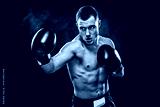 Sportsman muay thai boxer fighting in gloves in boxing cage. Isolated on black background with smoke. Copy Space.