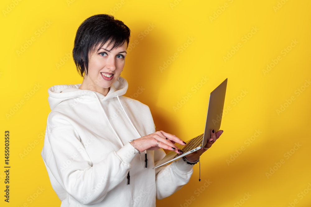 Freelance concept. Young pretty caucasian brunette woman in white jacket using modern laptop and smiling against yellow background