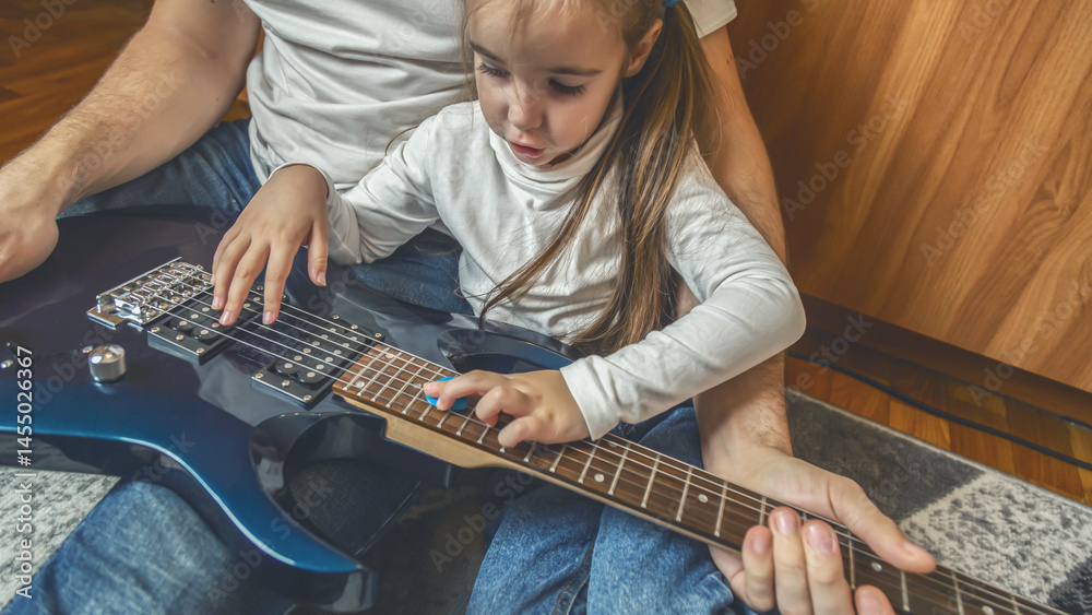 Happy dad teaches his cute daughter to play the guitar while sitting on floor next to bed at home.