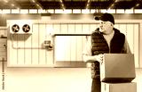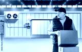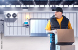 Man with boxes near cold storage warehouse. Freezer container behind loader. Refrigeration units inside industrial hangar. Freezer for storing frozen products. Man wants to take box in cold warehouse