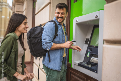 happy travelers couple, withdraw money from the ATM use credit card