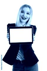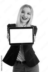 Business woman showing tablet with blank display for text or commercial advertisement ad