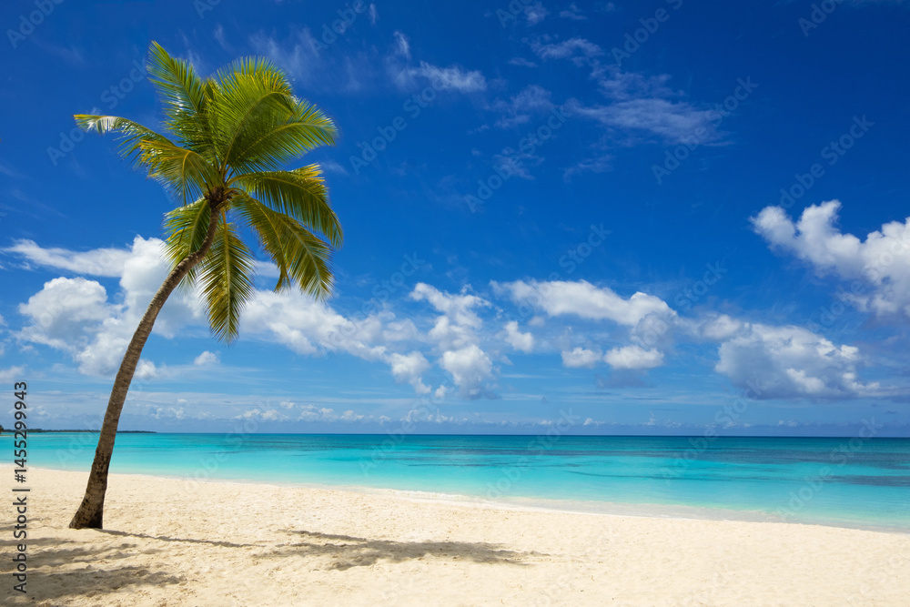 Beautiful tropical beach with golden sand, coconut palm against the backdrop of the azure ocean.