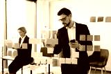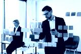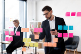 Corporate employees collaborating using glass board with colorful notes in professional workspace setting.