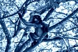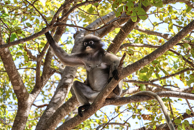 Cute dusky leaf monkey, spectacled langur sits on a tree branch in the jungle in its natural habitat