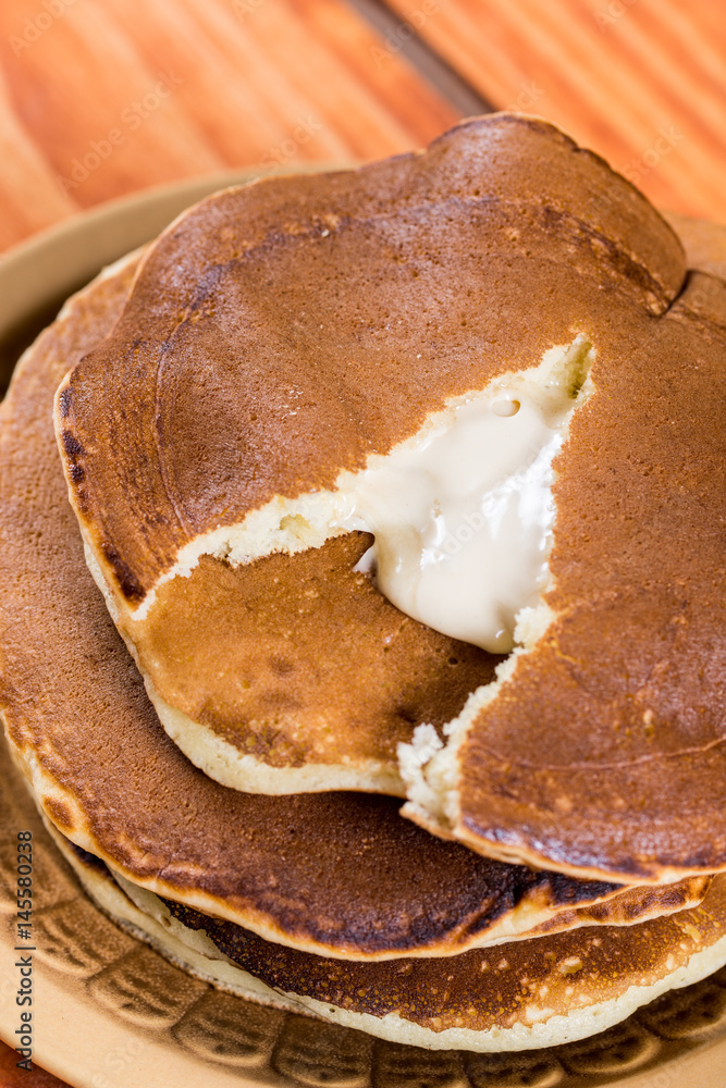 Closeup macro of stacked american pancakes stuffed with chocolate cream