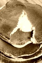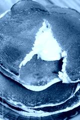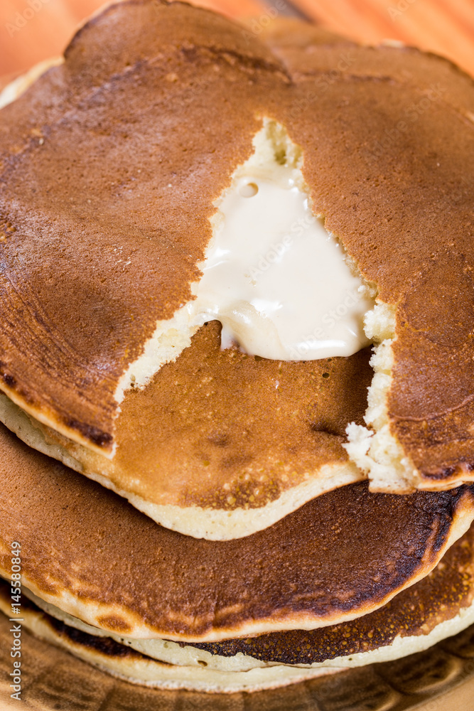Closeup macro of stacked american pancakes stuffed with chocolate cream