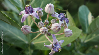 lose-up of Calotropis gigantea, also known as the crown flower or giant milkweed, with its distinctive purple star-shaped blooms.