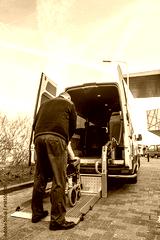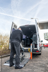 Driver Assisting Disabled Man To Board Wheelchair Lift Van
