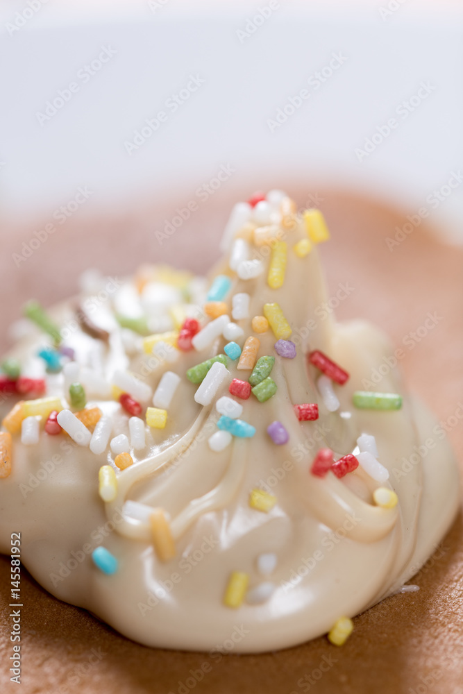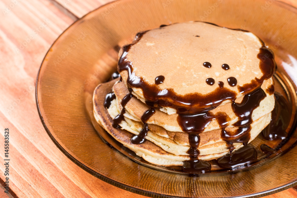 Chocolate cream with colorful sprinkles on the american pancakes