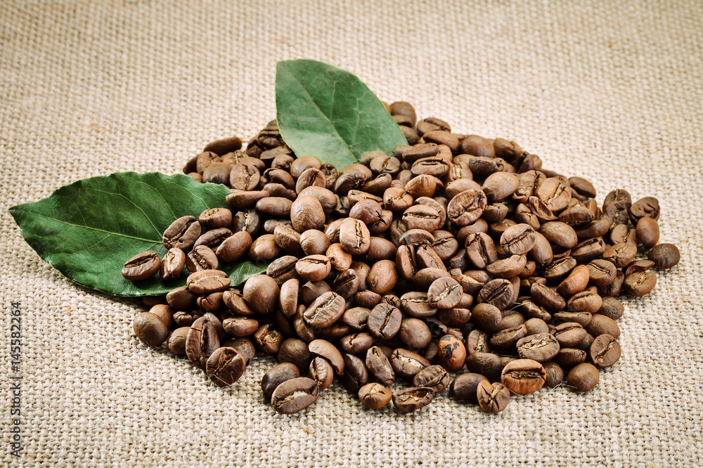 Coffee beans in brown spoon on sackcloth.