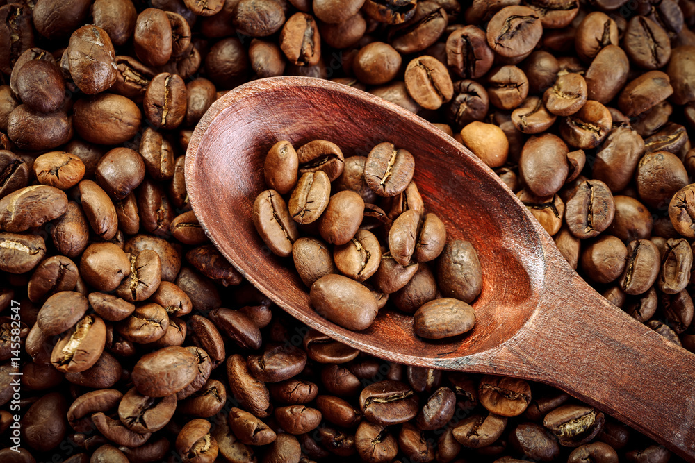 Coffee beans in brown spoon on sackcloth.