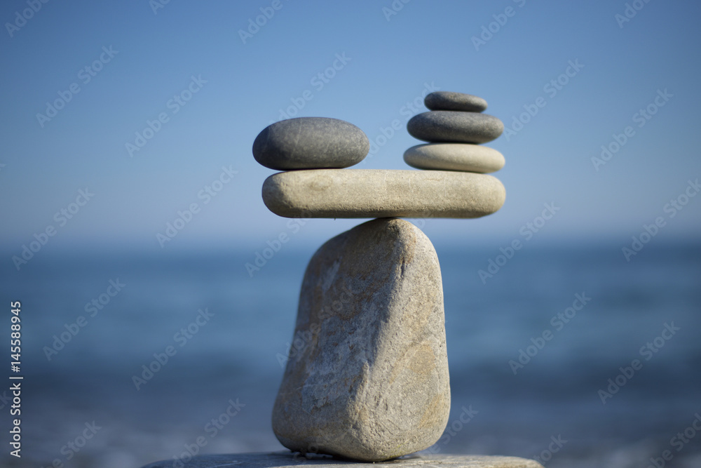 Stones pile background. Scales balance. Balanced stones on the top of boulder. Decide problem. To weight pros and cons. Balance of stones on a blue sky background with a copy space.