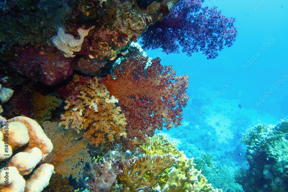 Beautiful red soft coral Dendronepthya. Underwater scene of biodiversity of coral reef ecosystem.