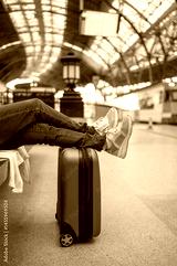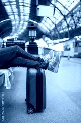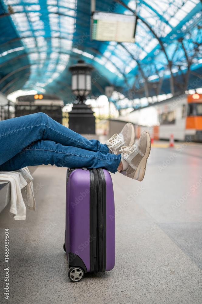 Tourist relaxing with legs on suitcase at train station