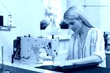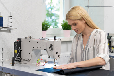 Blonde cute female designer sitting at the sewing machine and looking involved