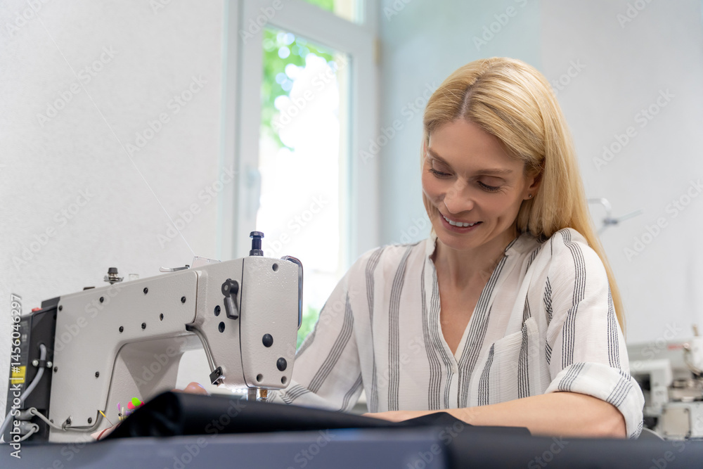 Blonde cute female designer sitting at the sewing machine and looking involved