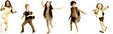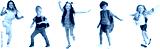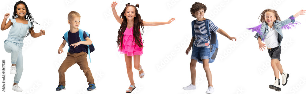 Children expressing joyful dance moves, wearing trendy clothes isolated on transparent background. Concept of childhood, fun, friendship, early development
