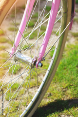 Stylish retro bike concept. Closeup photo of pink vintage bike wheel.