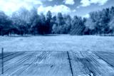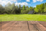 Empty wooden podium with copy space for showcasing eco-friendly or sustainable products and solar panels on lush green field background. Renewable energy and environmental protection concept.