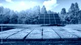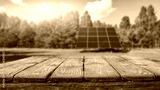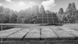 Empty wooden podium with copy space for showcasing eco-friendly or sustainable products and solar panels on lush green field background. Renewable energy and environmental protection concept.
