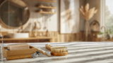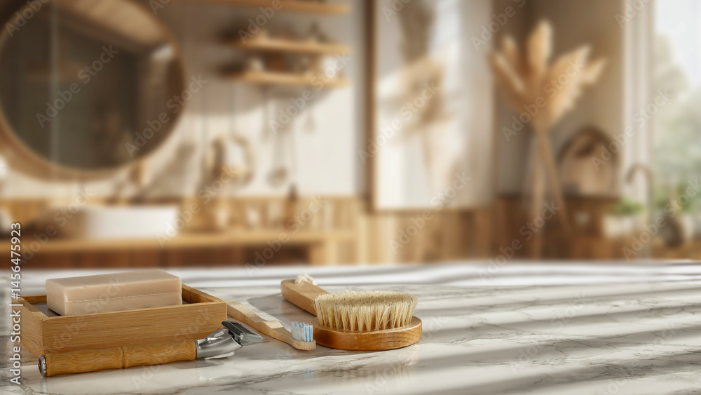 Cozy bathroom counter with wooden soap dispenser and accessories - warm natural bathroom interior with copy space.