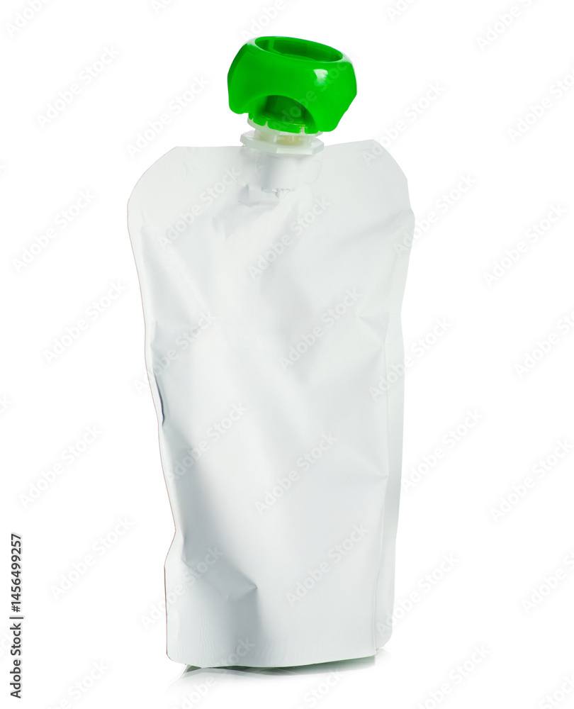 White baby fruit puree in squeeze pouch on white background isolation