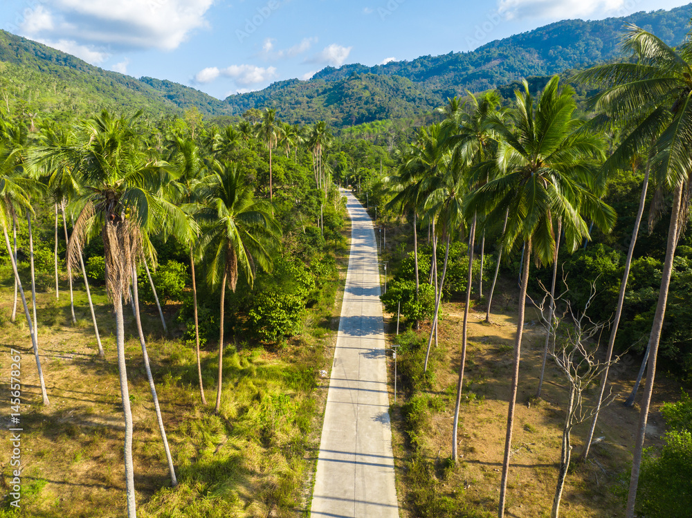 Serene journey through lush palm trees on a winding road beneath a bright blue sky