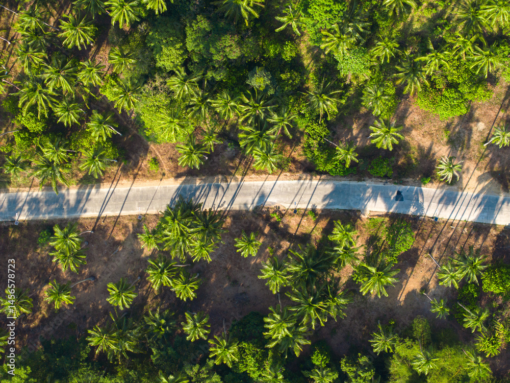 Lush palm tree landscape with winding road through vibrant green foliage in a tropical paradise