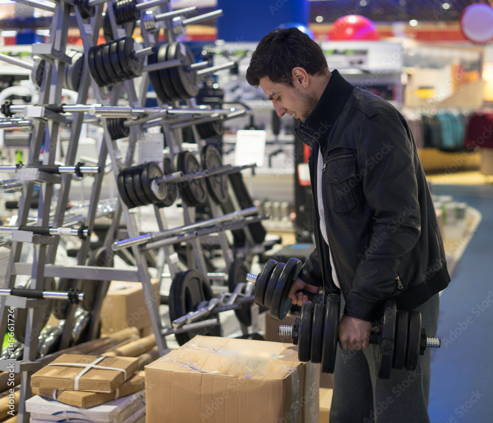 portrait of young male customer choosing dumbbells at supermarket store. He is putting dumbbells in box.