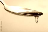 Honey pouring from spoon against a light background