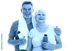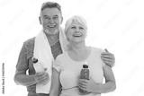 Fitness senior couple with towel and bottles