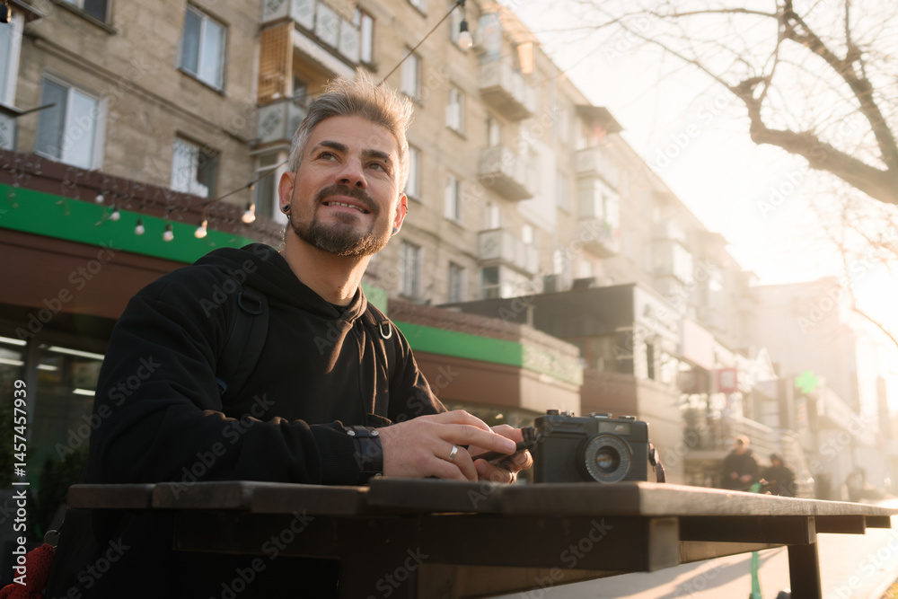 A man enjoys a sunny day at an outdoor cafe with a vintage camera.