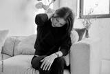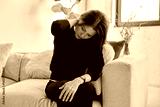 Middle aged unhappy woman experiencing neck joint pain sitting on sofa at home