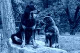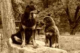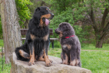 male black and gold Hovie dog hovawart and a Tibetan Mastiff puppy pose on a stone