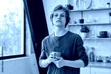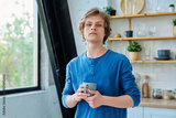 Teenage serious guy with cup in hands in home interior, looking at camera