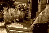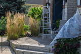 Beautiful and wispy Karl Foerster Feather Reed Grasses, Calamagrostis × acutiflora Karl Foerster, circles the freshly revitalized limestone and paver patio in a residential neighborhood.