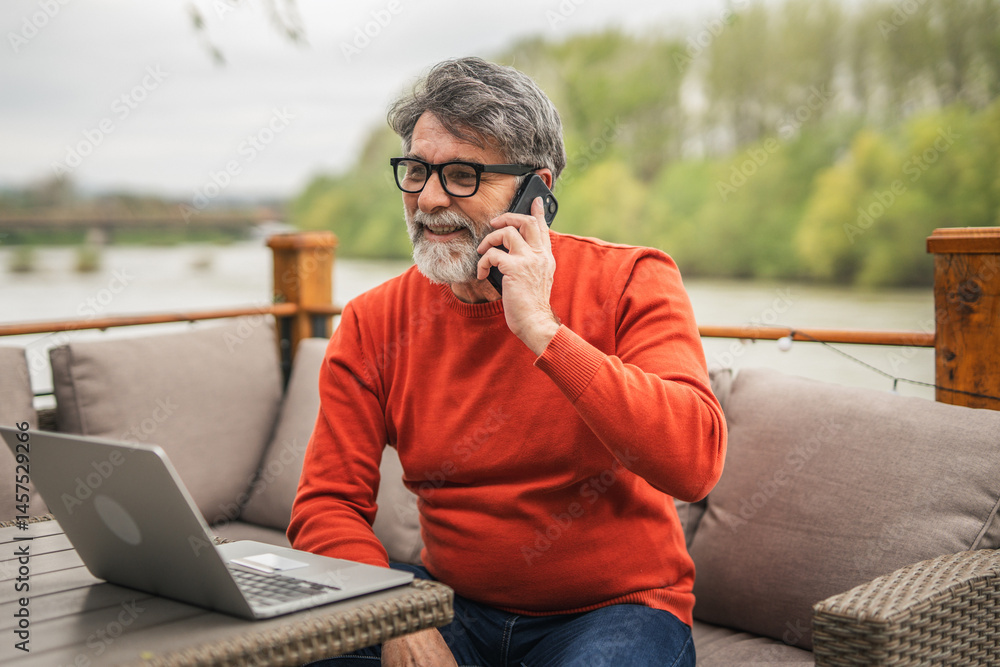 senior man sit on the terrace work on laptop and talk on mobile phone