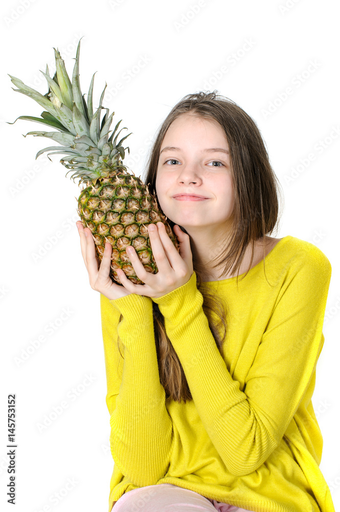 Charming young girl holds a large ripe pineapple in her hands..