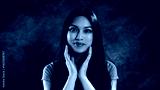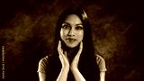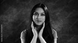 Studio portrait of a young woman holding her face with her hands, posing in front of a dark background