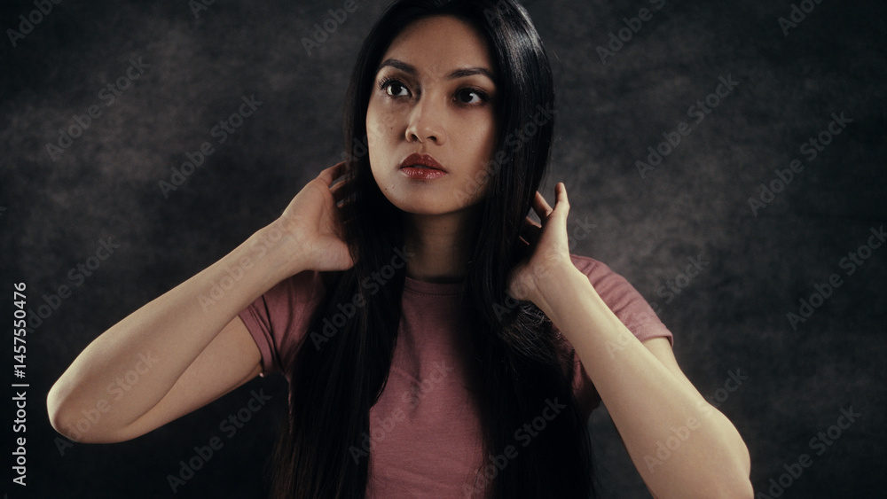 Studio portrait of young Asian woman touching her long black hair on dark background