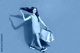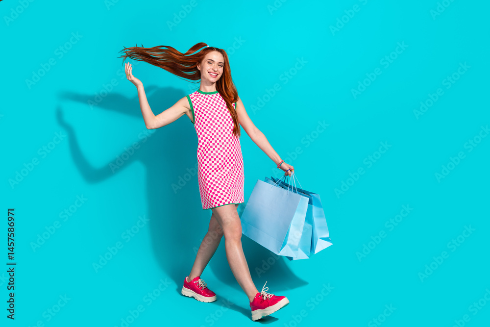 Young stylish woman with shopping bags in a vibrant outfit against a turquoise backdrop, smiling and enjoying her day