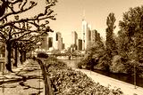 Frankfurt am Main, Sachsenhäuser Ufer. Rechts die Maininsel, im Hintergrund die Skyline. April 2017.