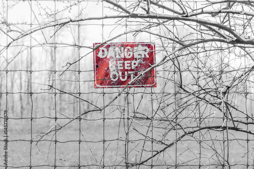 Red Danger sign posted to barbed fence tangled in branches, warning people to keep out