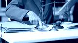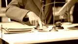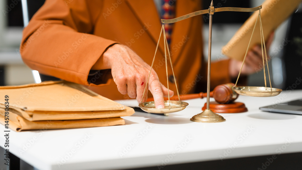 An elderly Caucasian male lawyer works at his desk in a law firm, offering legal advice and business law services. A gavel and documents symbolize justice and professionalism